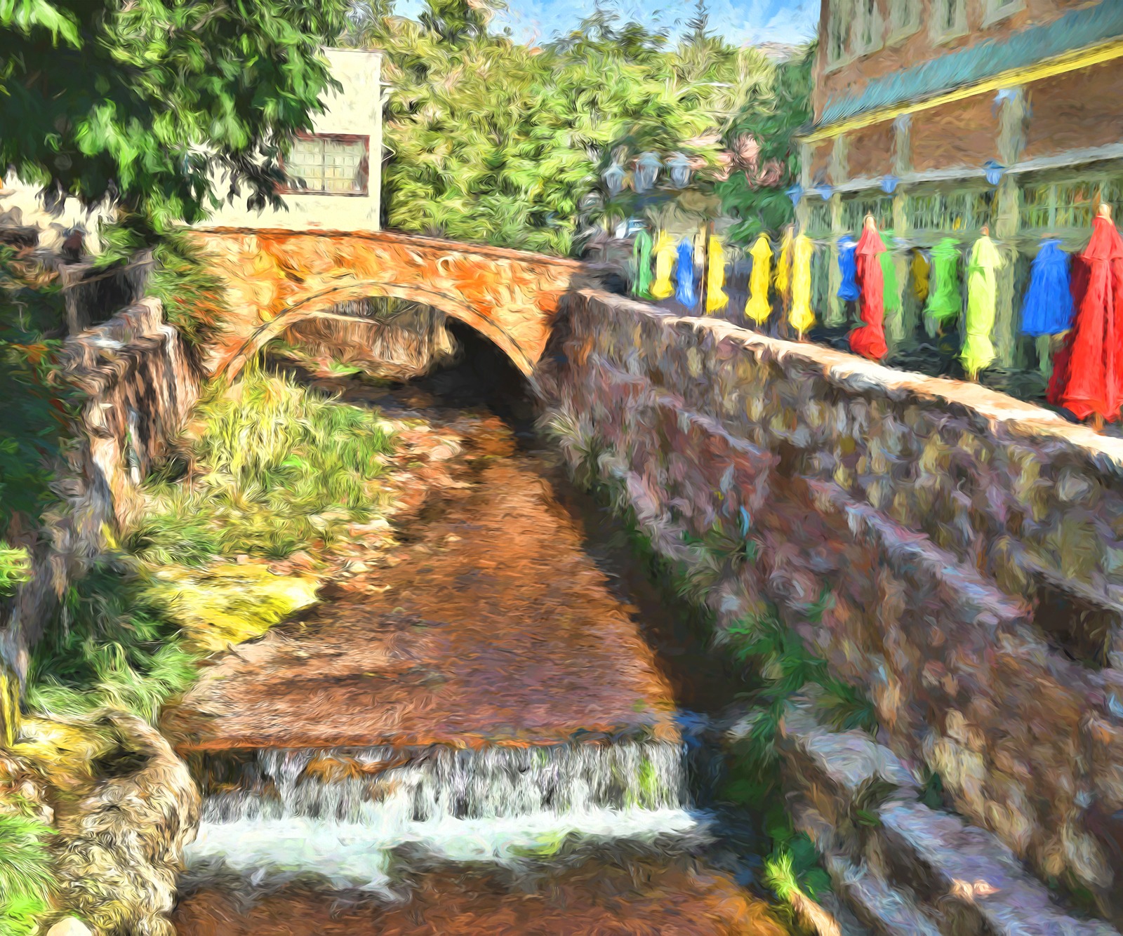 A signed, large, limited production, canvas print of a colorful scene from Manitou Springs Colorado. A select photo by artist/photographer, Michael McCarty, is re-imagined in the Impressionistic style of French artist Pierre-Auguste Renoir.