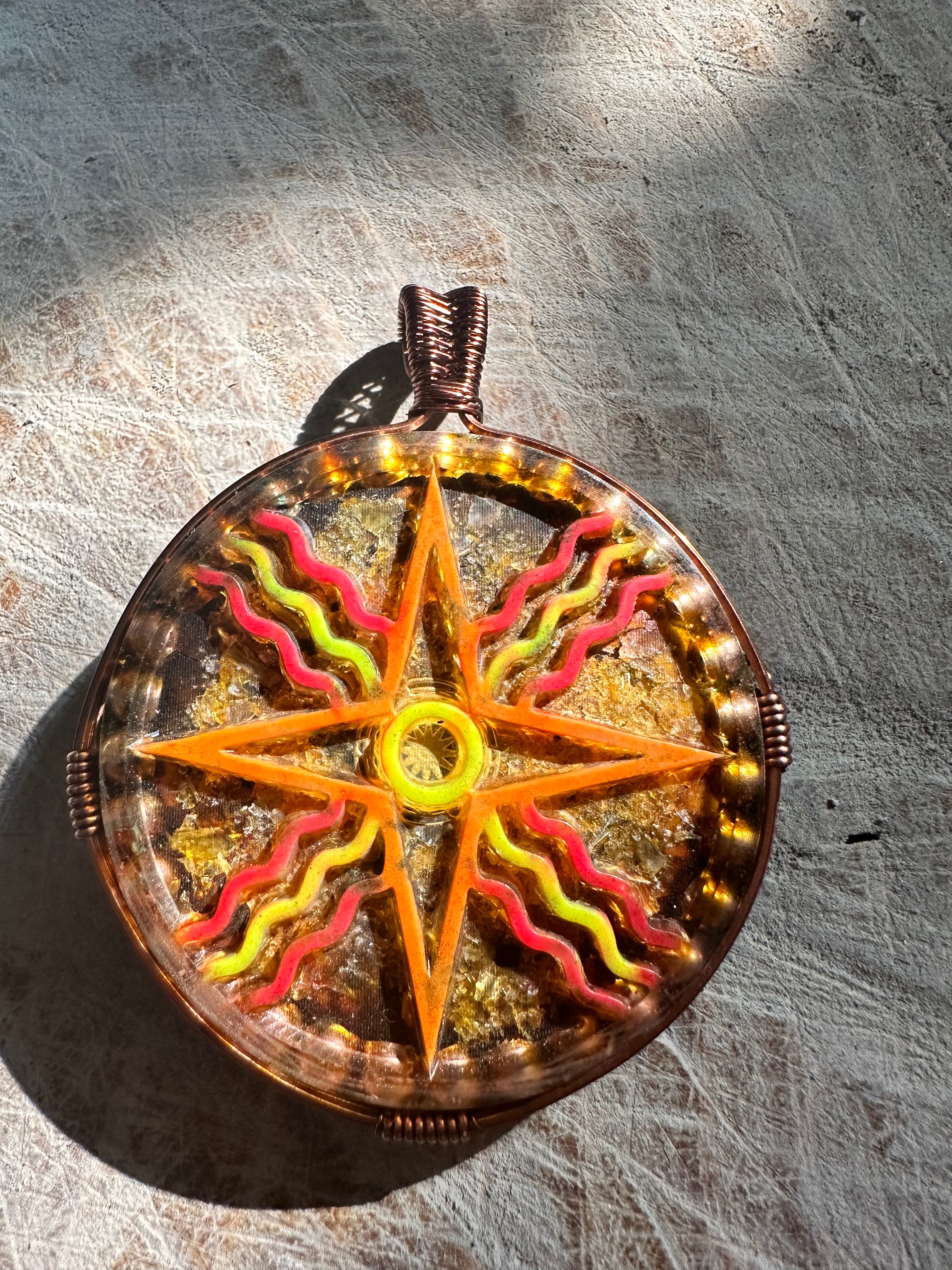 This item is a wire wrapped Orgonite Pendant. The symbol represents a Solar Disk of Shamash. This symbol has also been found in certain cymatic patterns. Orgonite is a combination of crystals and metals in resin together, it has been shown to help absorb and transmute energies such as the emf frequencies from cell phones, WiFi, Bluetooth and many other electronics.